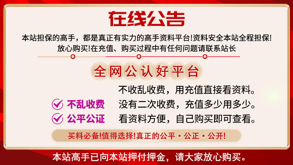本站担保的高手都是真正有实力的高手!资料安全本站全程担保!彩民放心购买!在充值、购买过程中有任何问题请联系管理员。(每期资料都经站长严格审核监督,对错不改,保证真实)资料达到(90%以上)验证通过后才可出售,每位高手的资料无法保证百分百期期中奖(请理性消费)论坛承诺所有资料绝对不会有错改对的作弊行为,保证彩民买到的是百分百真实可靠的资料,不会乱收费用,充值直接看资料,充值金币后在您需查看的资料下方隐藏区域点击【打赏高手】即可查看到高手发布的资料。真正的公平·公正·公开!买料必备!值得选择!